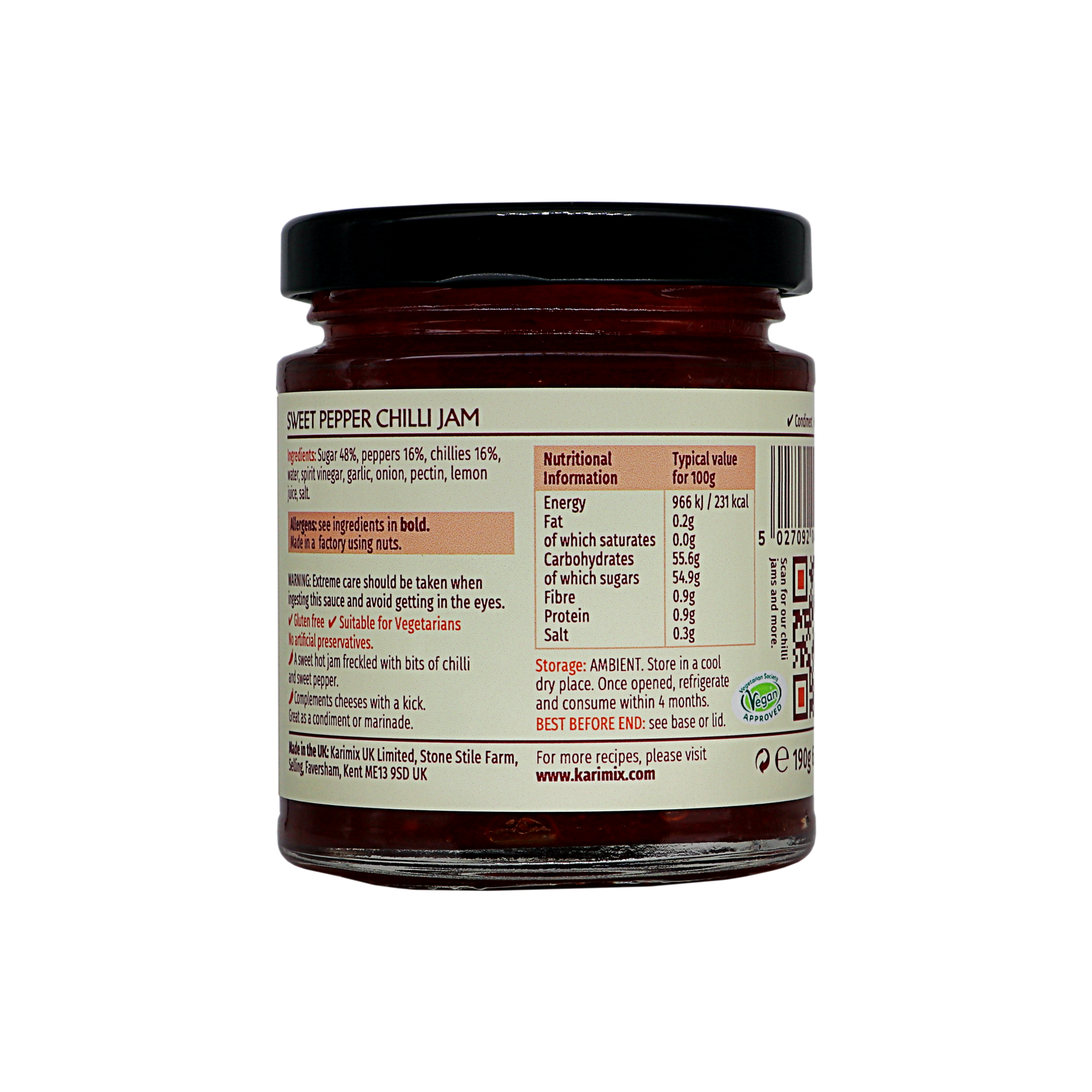 Sugar 48%, peppers 16%, chillies 16%, water, spirit vinegar, garlic, onion, pectin, lemon juice, salt