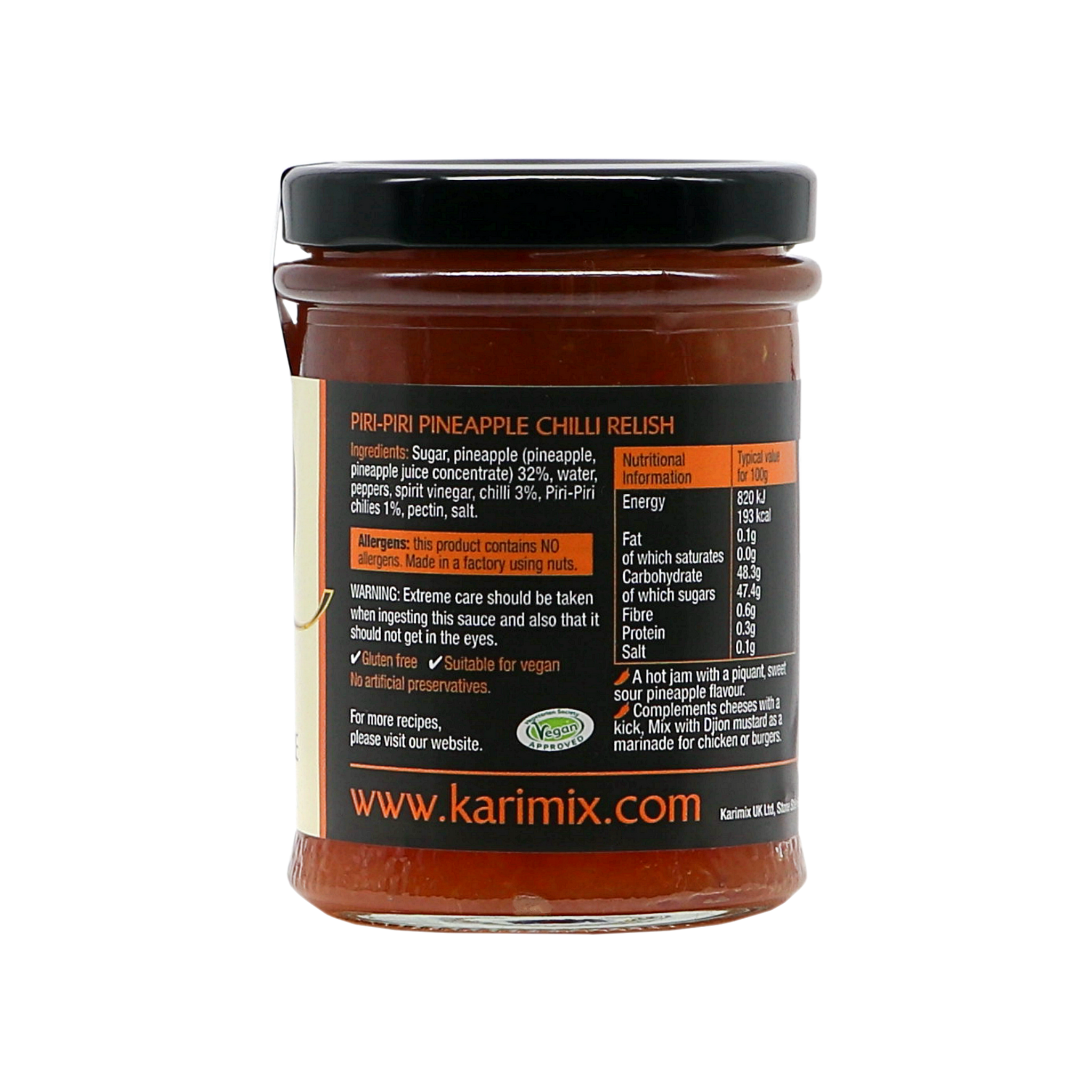 A hot jam with a piquant, sweet sour pineapple flavour. Complements cheese with a kick, mix with Dijon mustard as a marinade for chicken or burgers. Suitable for vegans and gluten free.
