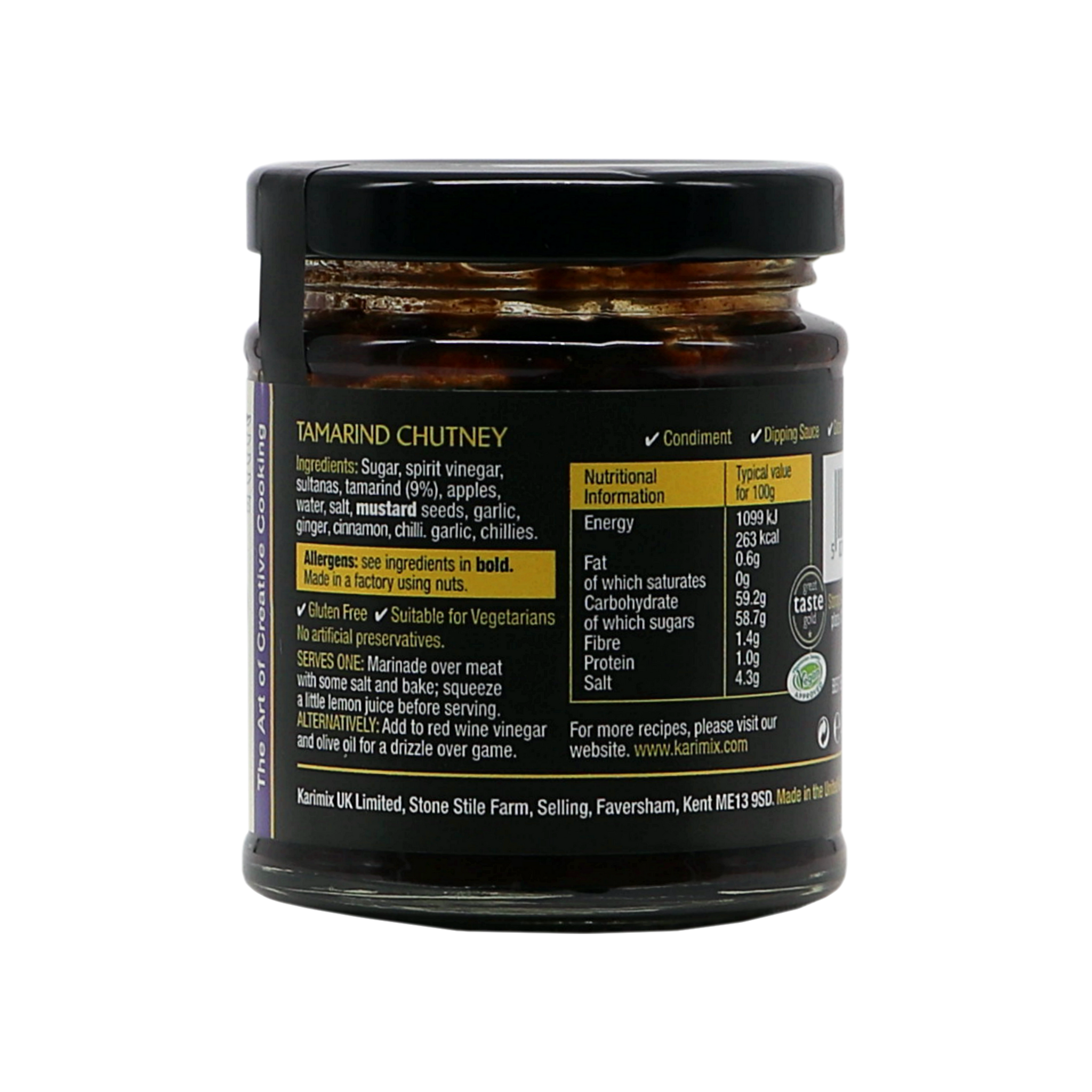An award winning product! A deliciously rich, sweet chutney made from tamarind puree, sultanas, ginger and a blend of aromatic spices, this chutney is Gluten Free and Suitable for vegetarians. Delicious when used to marinade meat before roasting or stir frying, or as an accompaniment to sausages, cold meats or cheeses, it's a great way to add a little middle eastern flavour to your Ploughman's! A mild heat with a sweet flavour.
