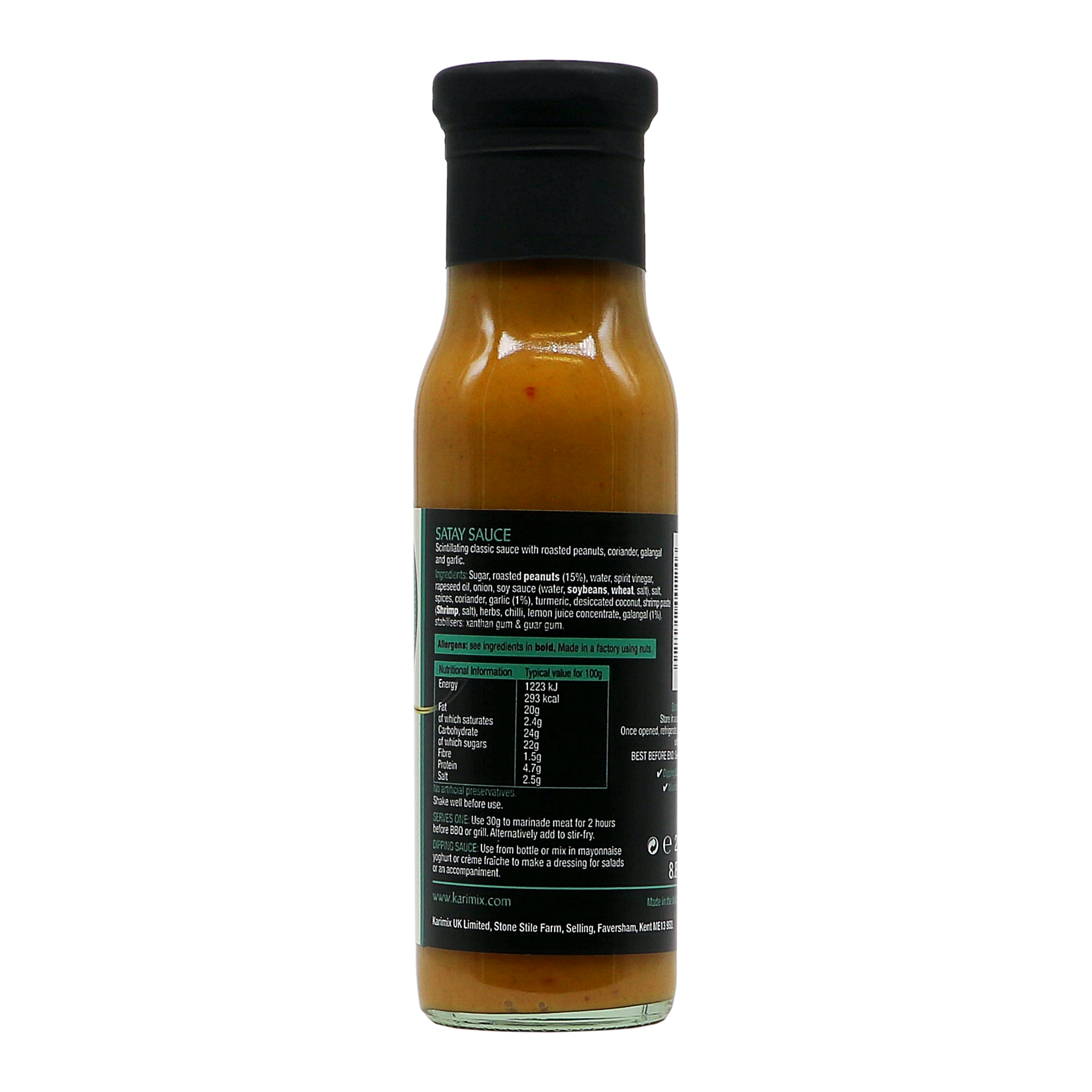 Sugar, water, peanuts 15%, spirit vinegar, rapeseed oil, onion, soy sauce (water, soybeans, wheat, salt), salt, ginger, coriander, garlic, turmeric, spices, chillies, coconut, shrimp paste [shrimp (crustaceans), salt], galangal, herbs, lemon juice, stabilisers: xanthan and guar gum