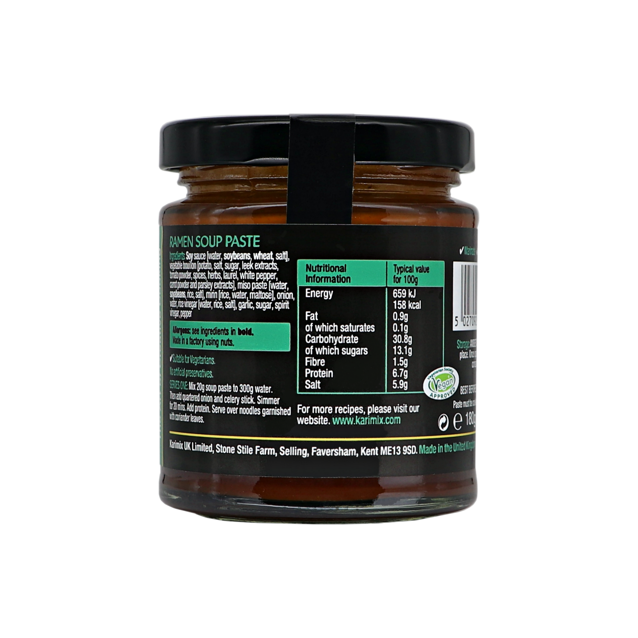 Soy sauce [water, soybeans, wheat, salt], vegetable bouillon [potato, salt, sugar, leek extracts, tomato powder, spices, herbs, laurel, white pepper, carrot powder and parsley extracts], miso paste [water, soyabeans, rice, salt], mirin [rice, water, maltose], onion, water, rice vinegar [water, rice, salt], garlic, sugar, spirit vinegar, pepper