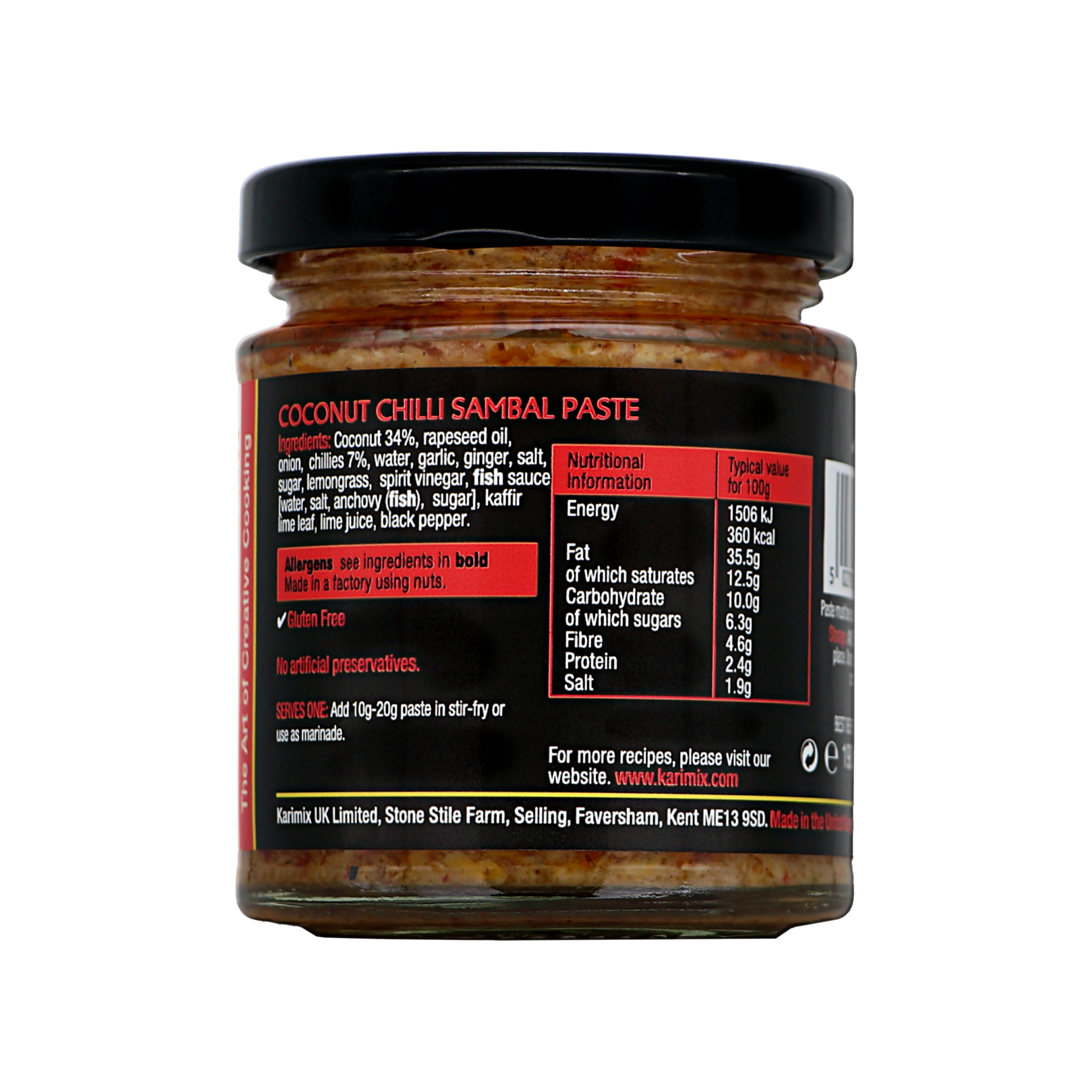 Coconut 34%, rapeseed oil, onion, chillies 7%, water, garlic, ginger, salt, sugar, lemongrass, spirit vinegar, fish sauce [water, salt, anchovy (fish), sugar], kaffir lime leaf, lime juice, black pepper